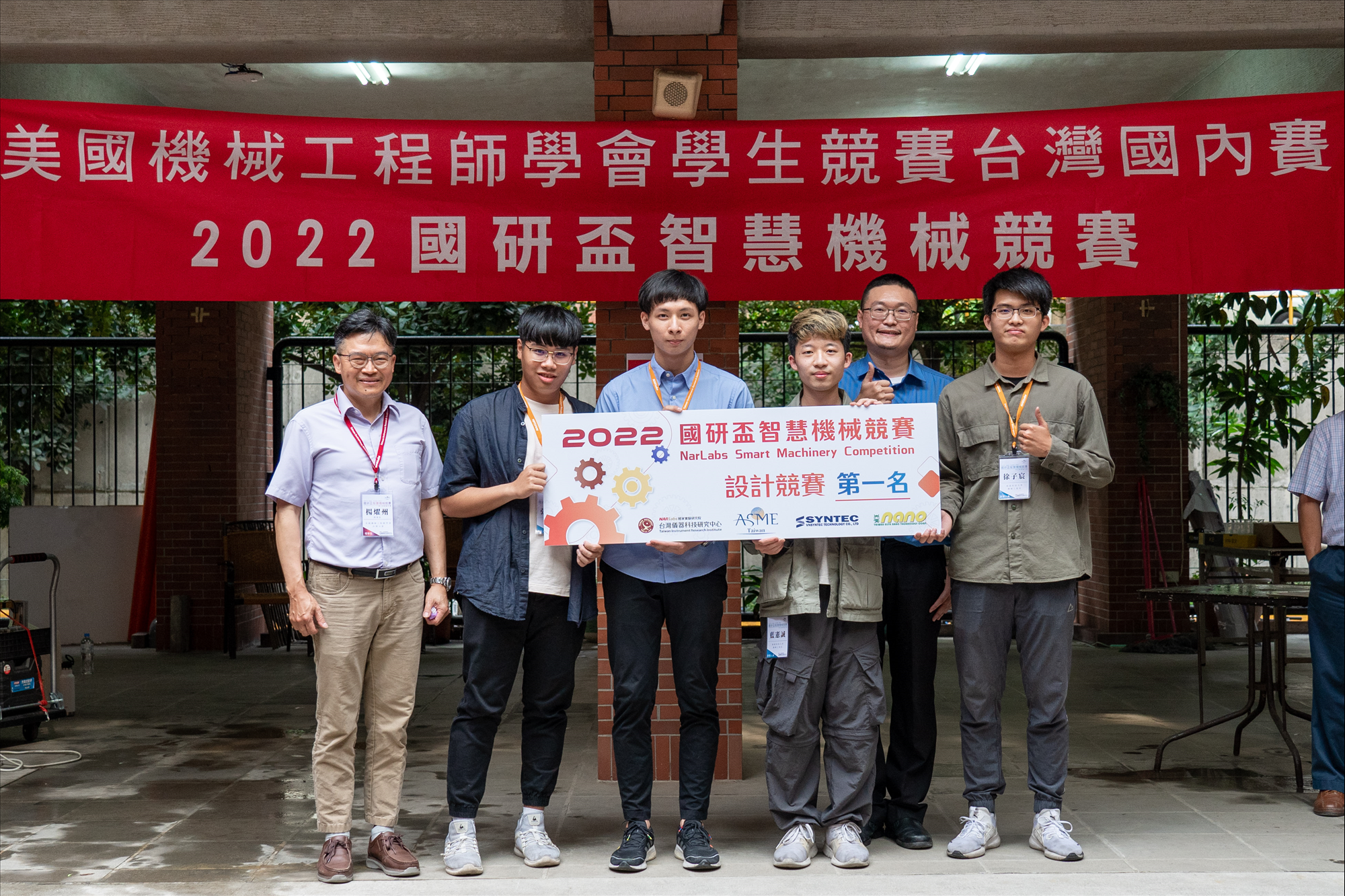 國研院儀科中心主任暨美國機械工程師學會台灣分會理事長楊燿州 (左一) 頒發設計競賽第一名給南臺科技大學團隊