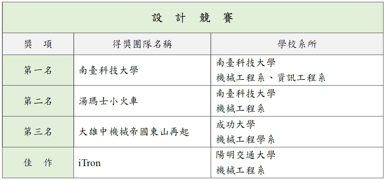 本次競賽除著重機器人的移動速度及負重能力,參賽隊伍更需研究如何有效利用水的位能轉換驅動機器人前進,考驗學生的基礎科學運用及機電能力。最終比賽結果由南臺科技大學「南臺科技大學」團隊拔得頭籌獲得第一名,此團隊的作品具有精準的方向操控能力,不但負重能力佳且掌握這次比賽水的位能轉換動能主題,南臺科技大學「湯瑪士小火車」團隊以及成功大學「大雄中機械帝國東山再起」團隊緊追在後,分獲二、三名、佳作則由陽明交通大學大學「iTron」團隊獲得。