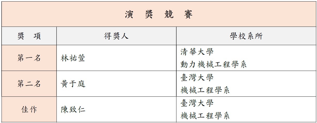另一項為演講競賽,講題不限,只要與機械相關或是個人在學期間研究成果發表即可,全程需以英文演講,但非英文能力檢定,評審重點在於學生於機械相關議題的分析與分享能力。清華大學林祐萱極具邏輯思考針對主題條理分析及沉著穩健的台風,贏得評審的高度評價,奪得第一名、臺灣大學黃于庭以精彩豐富的主題分享獲得第二名佳績。