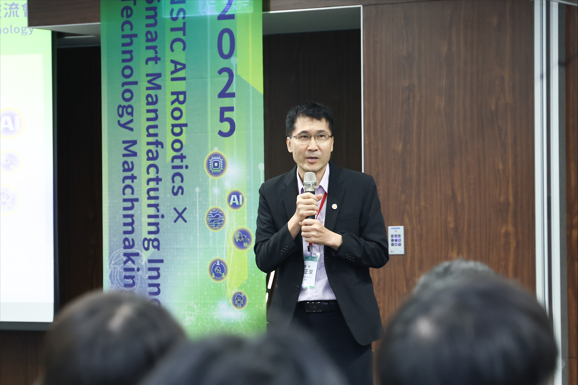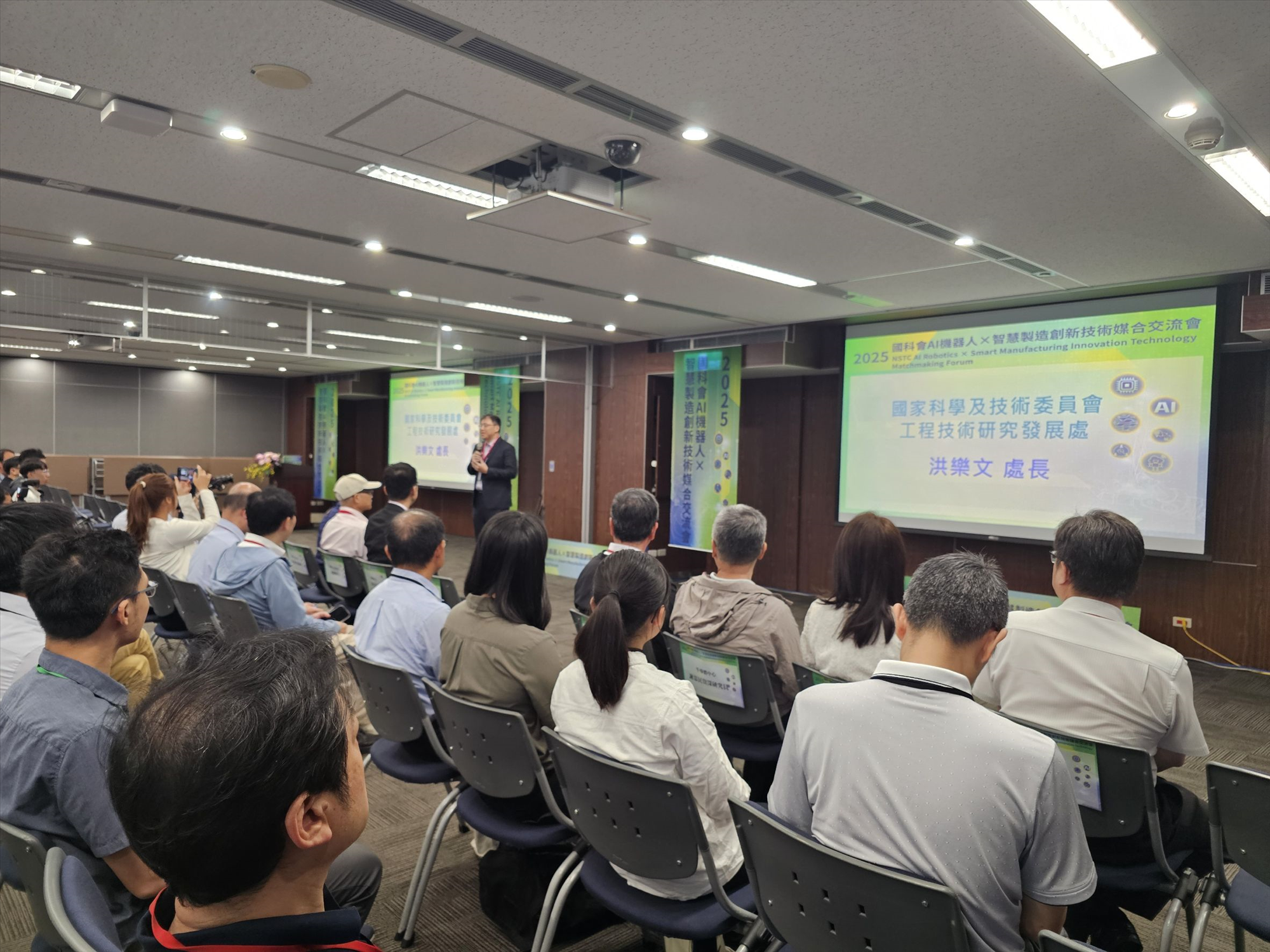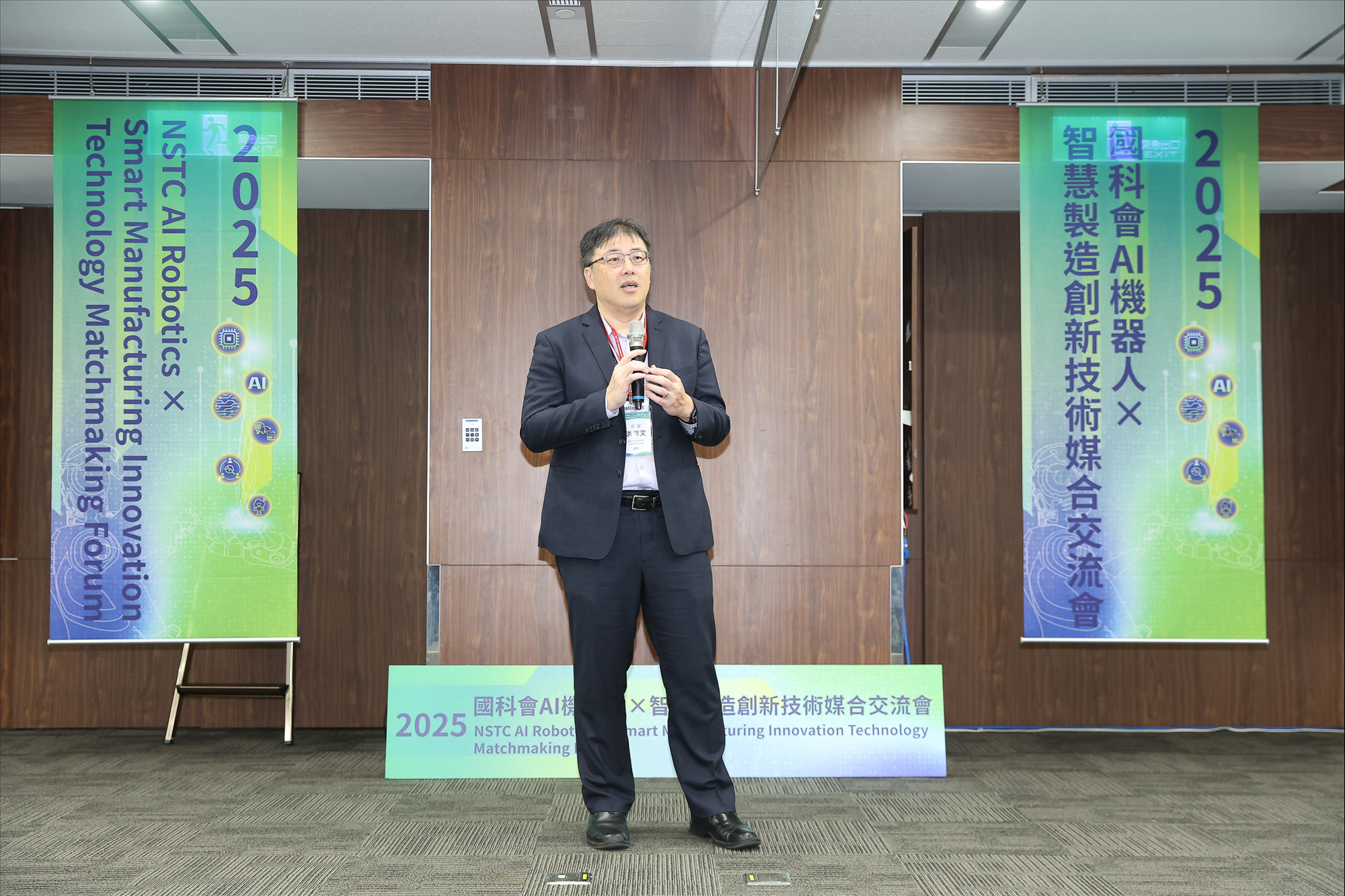 國科會工程技術研究發展處-洪樂文處長進行「2025 國科會 AI 機器人 × 智慧製造創新技術媒合交流會」開幕致詞。
