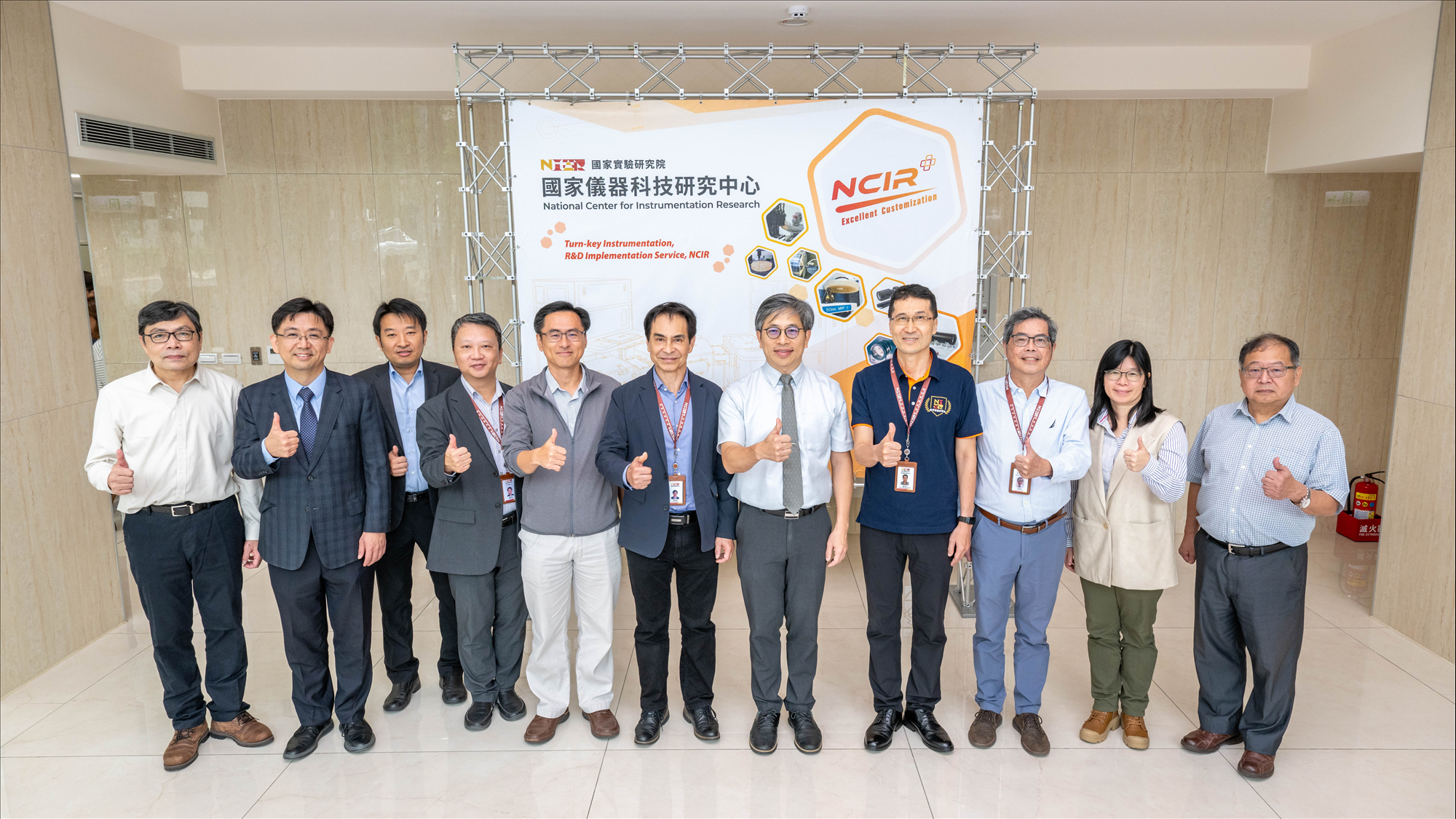 歡迎全院主管到訪國儀中心,左起為科技政策研究與資訊中心黃錫瑜主任、台灣海洋科技研究中心孟培傑主任、台灣半導體研究中心劉建男主任、國家地震工程研究中心歐昱辰主任、國家實驗研究院林俊良副院長、國家實驗研究院蔡宏營院⻑、國家儀器科技研究中心潘正堂主任、國家實驗研究院邱佳松主任秘書、國家實驗研究院徐玉學營運長、國家高速網路與計算中心張朝亮主任以及國家生物模式中心秦咸靜主任。