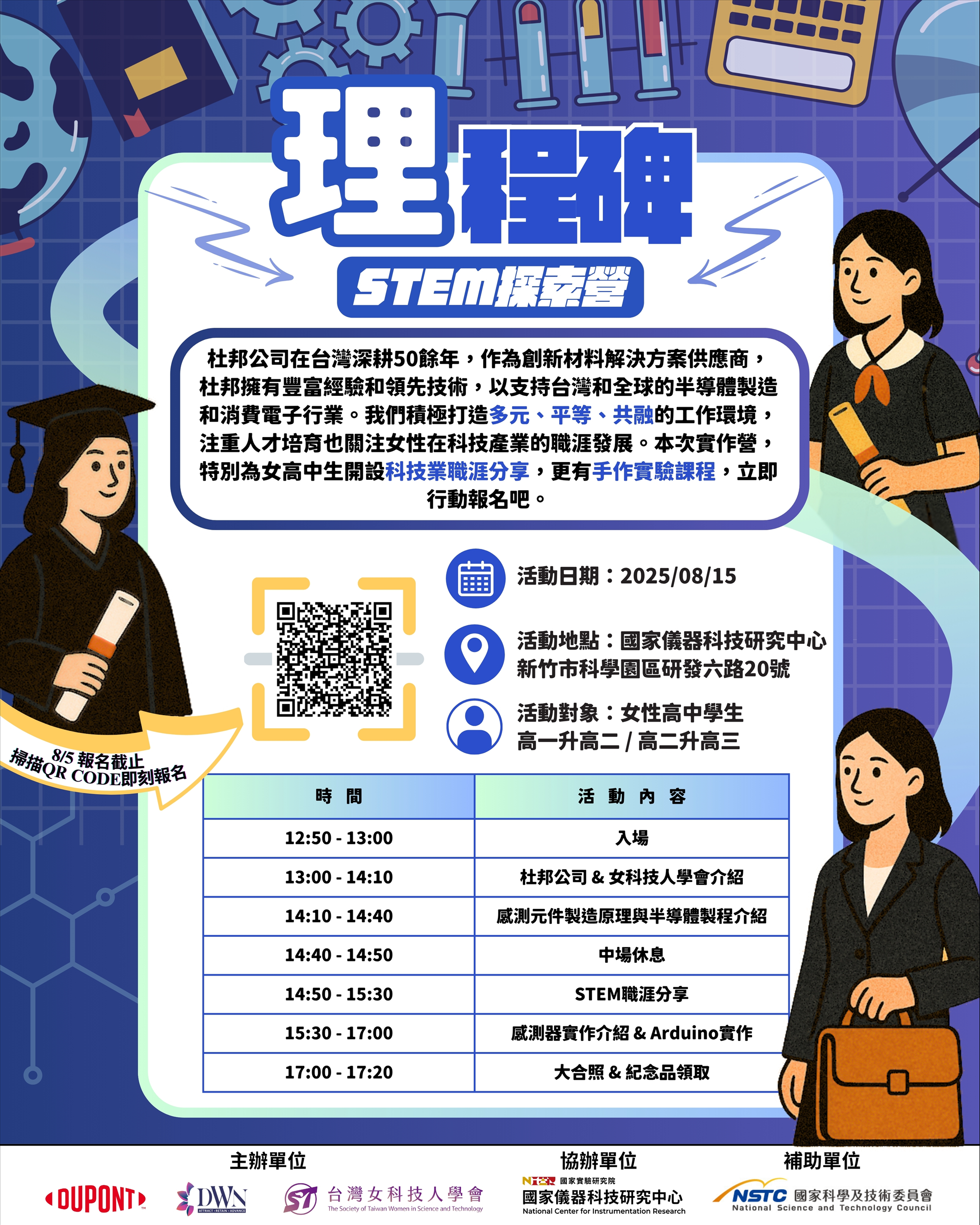 為培育女性參與科技領域,並積極推廣 STEM (Science, Technology, Engineering & Math) 教育,國儀中心與「女科技人學會」及「台灣杜邦女力聯盟」合辦高中生暑期「理程碑 STEM 探索營」,本活動除介紹與推廣 STEM 領域教育的核心價值、職涯與學習經驗分享,並由國儀中心設計感測器主題教學及手做體驗,帶領高中生學習跨領域知識與技能。