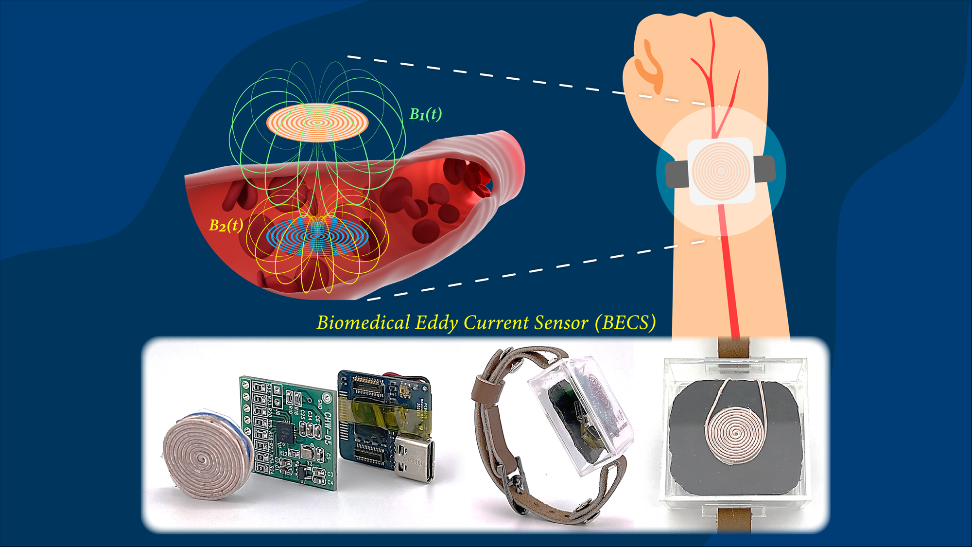 本期刊封面圖由國立清華大學醫工系王廷瑋副教授團隊提供。團隊以電磁感應原理開發生醫渦流感測器 (Biomedical Eddy Current Sensor, BECS),將感測線圈、LC 諧振電路與無線通訊模組整合於穿戴式手錶中,透過線圈經由錶背向手腕血管發射交流磁場,量測手腕血管搏動所引起的共振頻率變化。相較於傳統光學感測器,BECS 具膚色友善與較佳穿透特性,可提升不同膚色族群的穿戴適用性,且無須於錶殼底蓋預留透光區域,有助於維持裝置機構完整性並簡化製造流程。實驗結果亦顯示,此感測器於不同膚色受測者之脈搏量測上具穩健表現,並展現其於心率監測、連續血壓監測及心律不整辨識上的應用潛力。相關成果已發表於國際儀器學與量測領域之頂尖期刊《IEEE Transactions on Instrumentation and Measurement》。