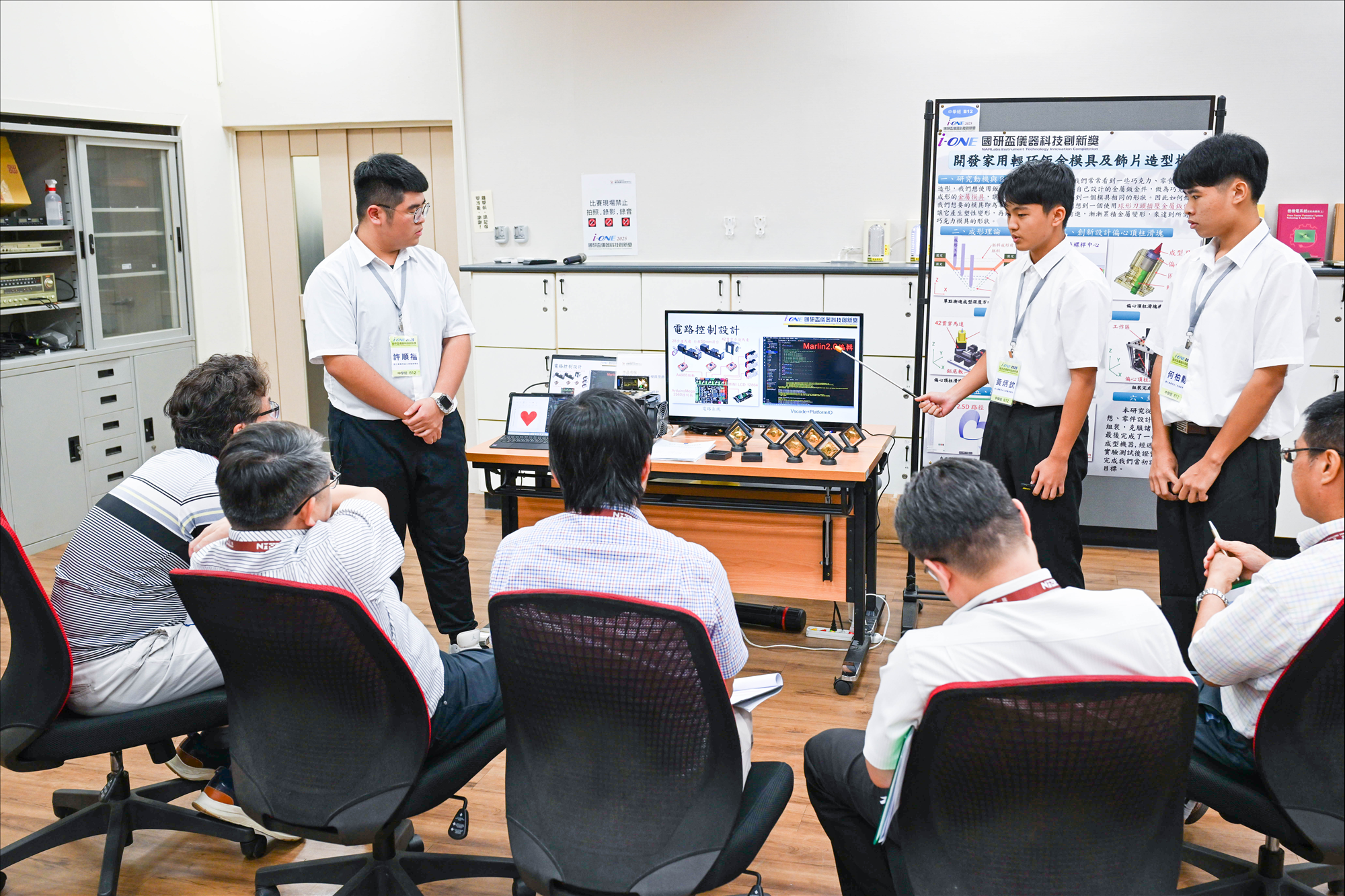 中學組嘉義高工團隊所完成之「開發家用輕巧鈑金模具及飾片造型機」,展現自動化操作、高效率生產與高精密度加工等特色,整體系統設計完善,從理論建構、模組設計與測試、機台組裝到效能驗證,作品以高完成度獲得評審一致肯定。