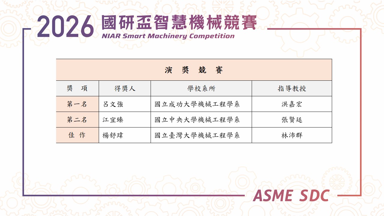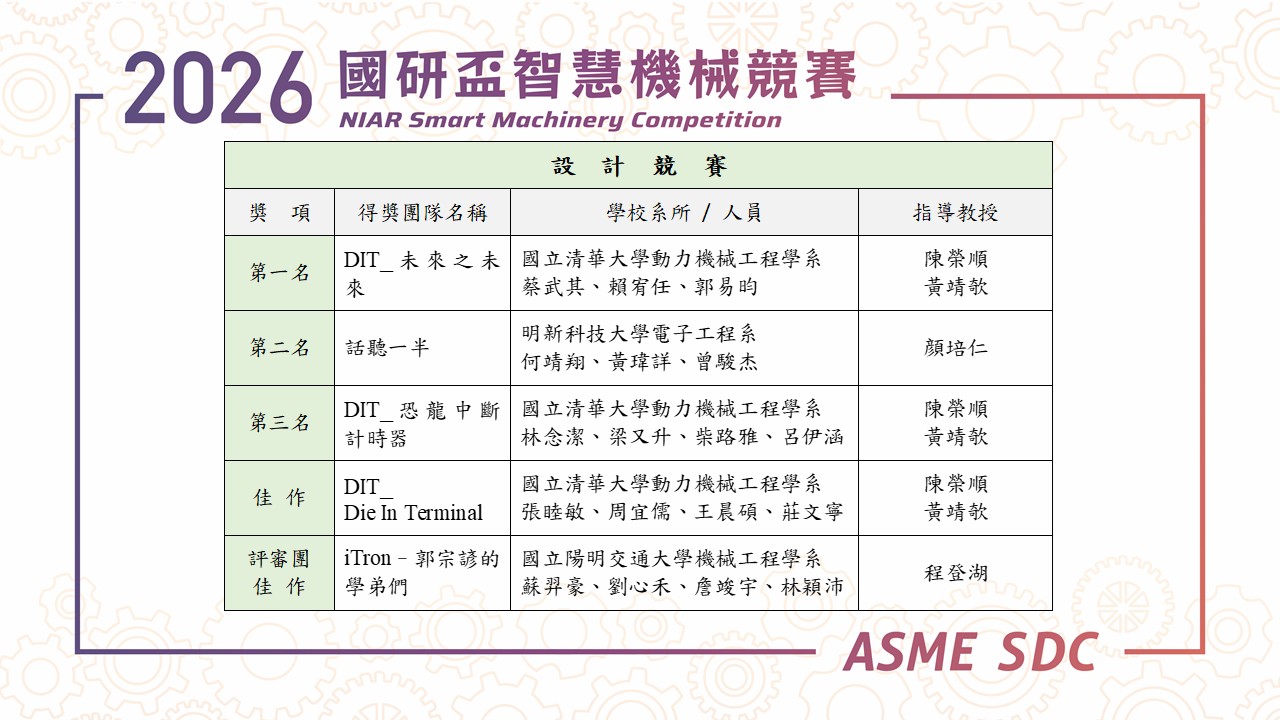 國科會轄下國家實驗研究院國家儀器科技研究中心 (國研院國儀中心) 協同美國機械工程師學會 (ASME) 台灣分會舉辦「國研盃智慧機械競賽」學生競賽 (SDC),於 3 月 28 日齊聚成功大學進行「穿梭水泥叢林的靈活清道夫」多功能智慧垃圾車分撿競速賽,由清華大學「DIT_未來之未來」團隊脫穎而出勇奪冠軍,演講競賽則由成功大學呂文強獲得第一名殊榮。