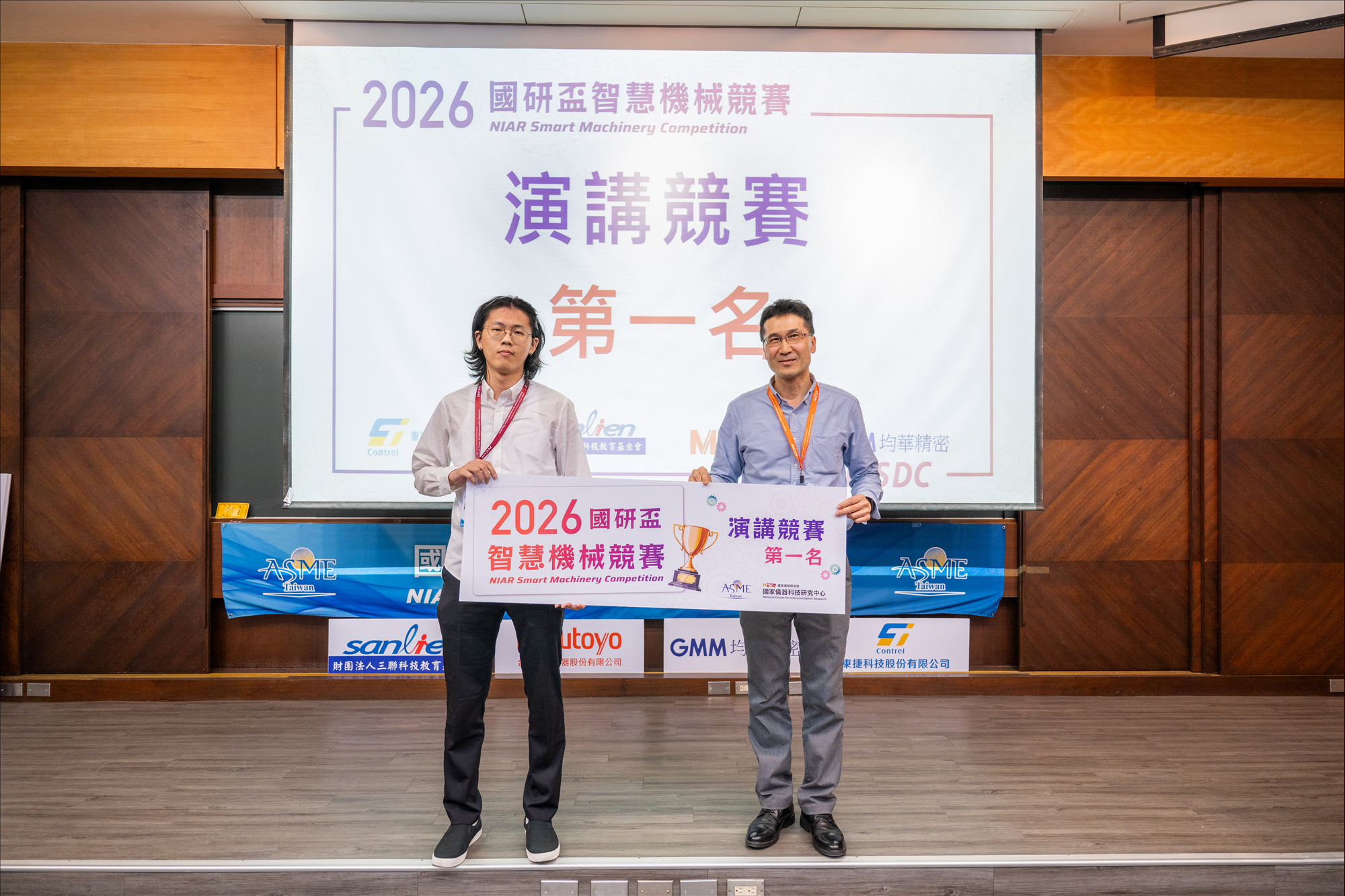 另一項以機械領域為主題的「英文演講競賽」,著重於參賽學生對機械議題的洞察力、分析能力,以及研究成果的呈現技巧,成功大學呂文強展現專業與自信,獲得評審高度認可榮登第一;中央大學江宜臻以創新思維吸引評審目光,榮獲第二名。