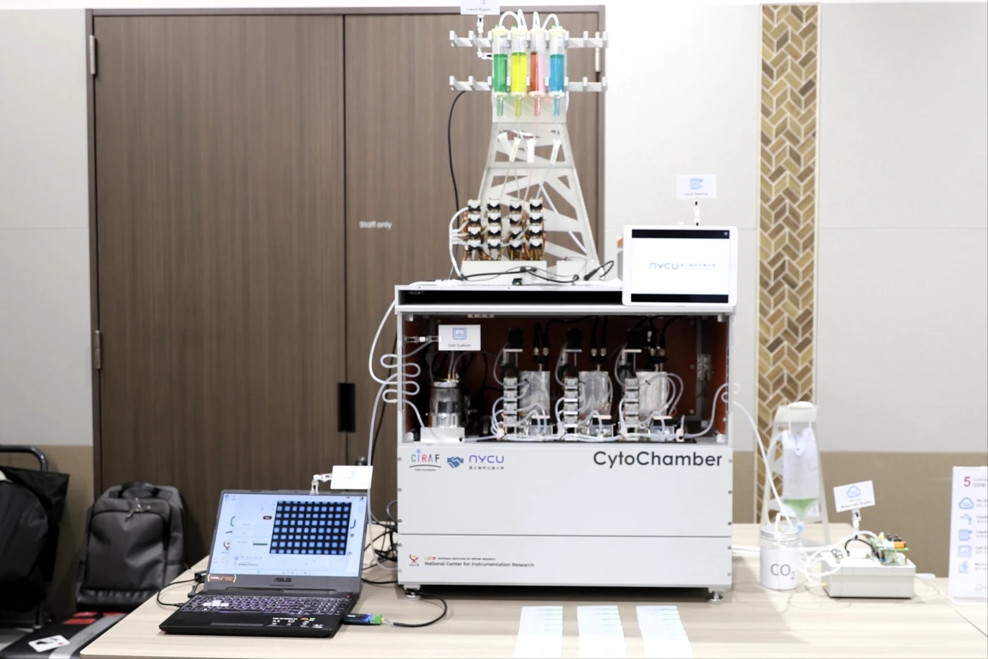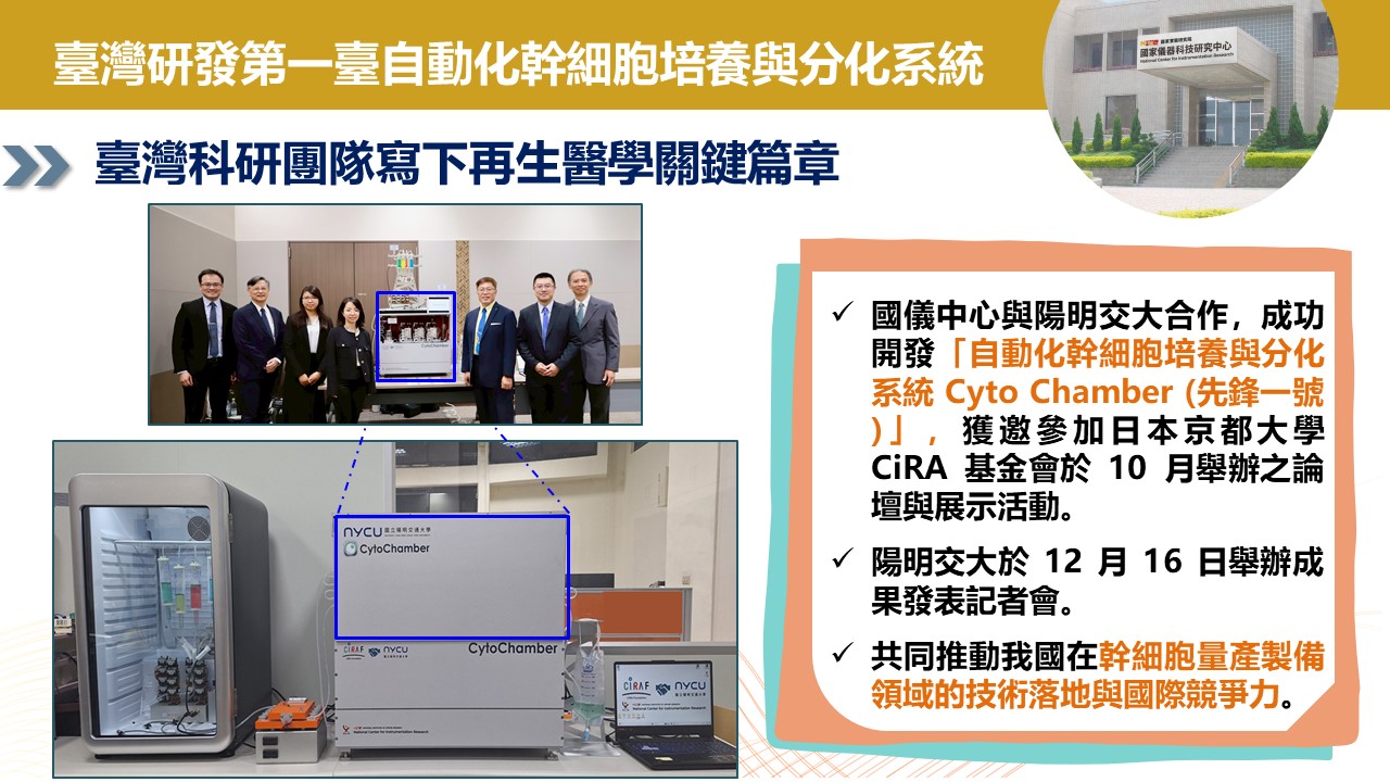 Cyto Chamber (先鋒一號) 由陽明交大與國家實驗研究院國家儀器科技研究中心共同開發,該系統可以自動化完成幹細胞的培養與分盤(1)。從溫控、二氧化碳濃度調控、培養液供給與排除,到細胞顯微攝影一氣呵成。這些原本仰賴大量人力的繁瑣步驟,如今透過自動化得以高效率完成,象徵再生醫學邁向產業化的重要里程碑。