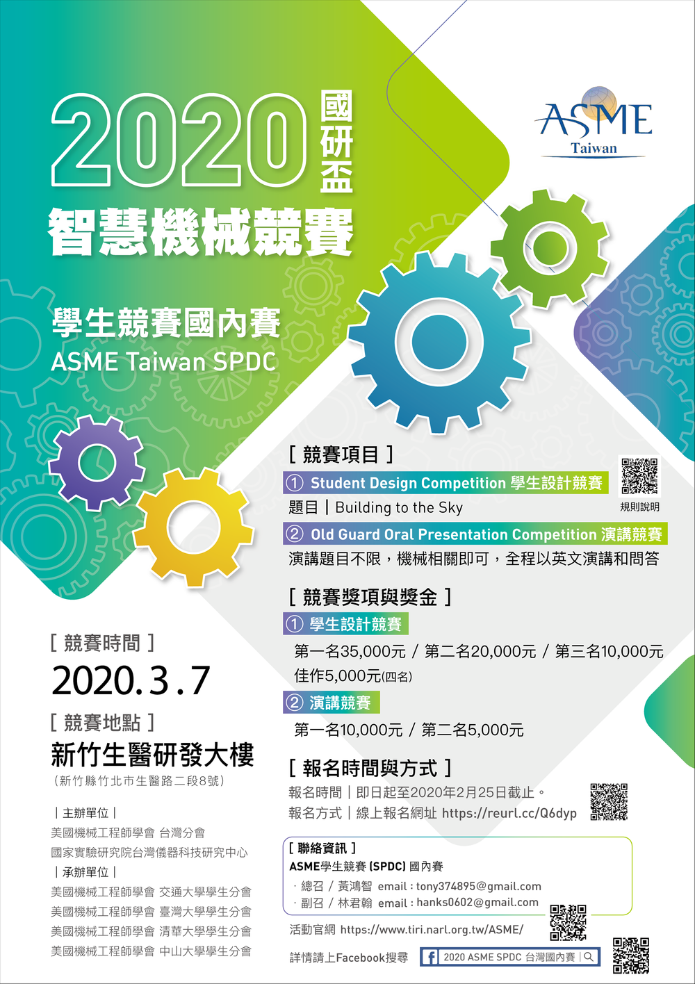 國家實驗研究院台灣儀器科技研究中心協同美國機械工程師學會 (ASME) 台灣分會舉辦「2020 國研盃智慧機械競賽」學生競賽 (SPDC),即日起至 2020 年 2 月 25 日接受徵件,獲得優勝之隊伍及個人將取得台灣區代表資格,得以參加 ASME SPDC 區域賽,若再獲勝則可參加總決賽,與來自全球各地的隊伍一較高下。